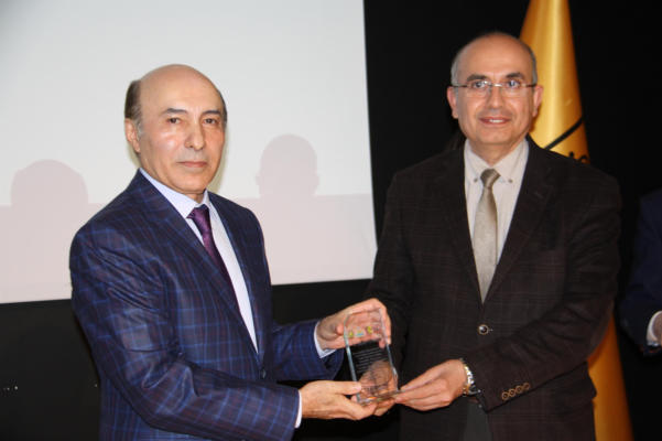 Dicle Üniversitesi Rektörü Prof. Dr. Talip Gül, Haldun Özbudun'a ödülünü takdim etti. (24 Kasım 2017)