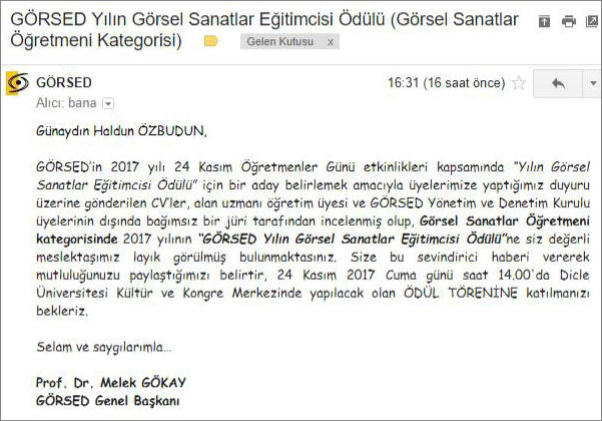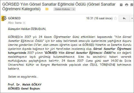 Haldun Özbudun'a gönderilen GÖRSED ödül bildirim e-Postası